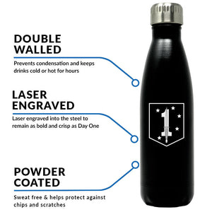 Our Marine Corps water bottle features the 1st MSOB logo. And you don’t think we’d screen print this artwork, do you? Of course not. The images are laser-etched into the steel to remain forever as bold and crisp as they appeared on Day One.