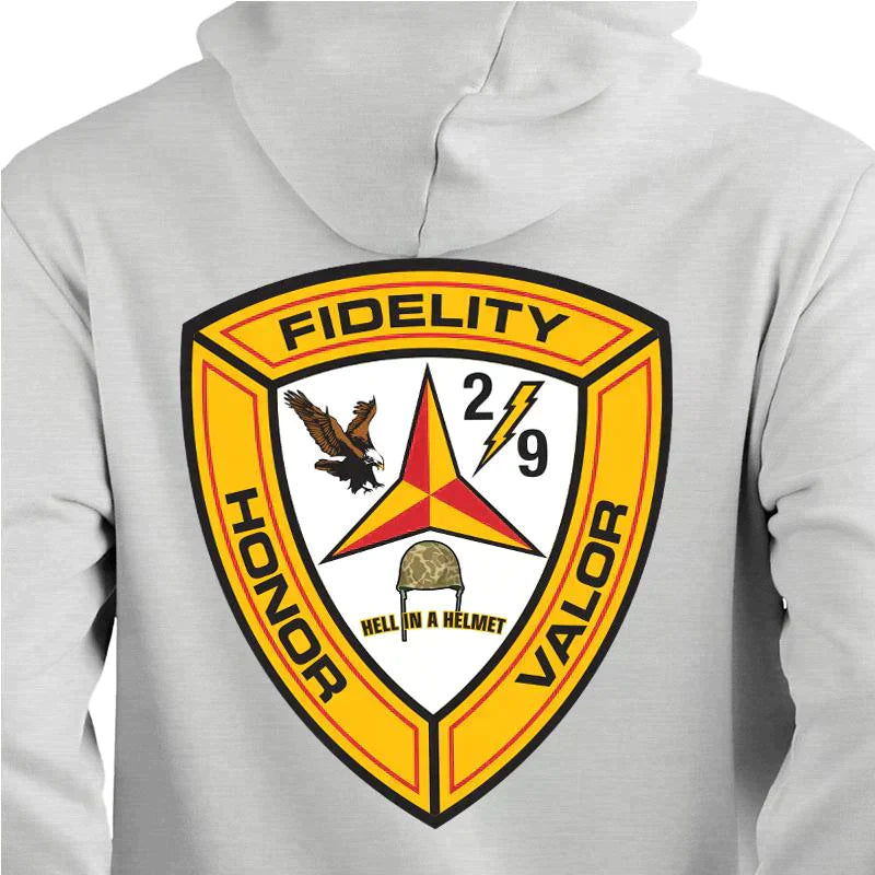 About our Marine Sweatshirts, the 2nd Bn 9th Marines hoodie is always a great choice. This Marine Corps hoodie is made of a 50/50 cotton/poly blend and is spill-resistant. In your effort to satisfy your Marine Corps sweatshirt needs, the hoodie will not come short.