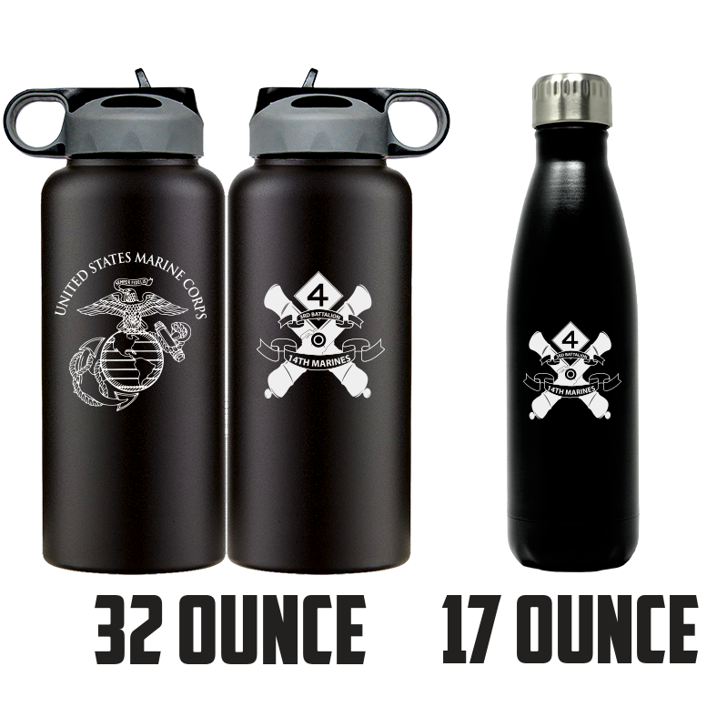 Our 3rd Bn 14th Marines Marines USMC water bottles are built from pro-grade stainless steel and finished in durable matte black to survive any terrain – desert, office, or gym. Double-wall vacuum insulation eliminates condensation and keeps your favorite beverages cold for up to 24 hours, or your coffee hot for up to 12.