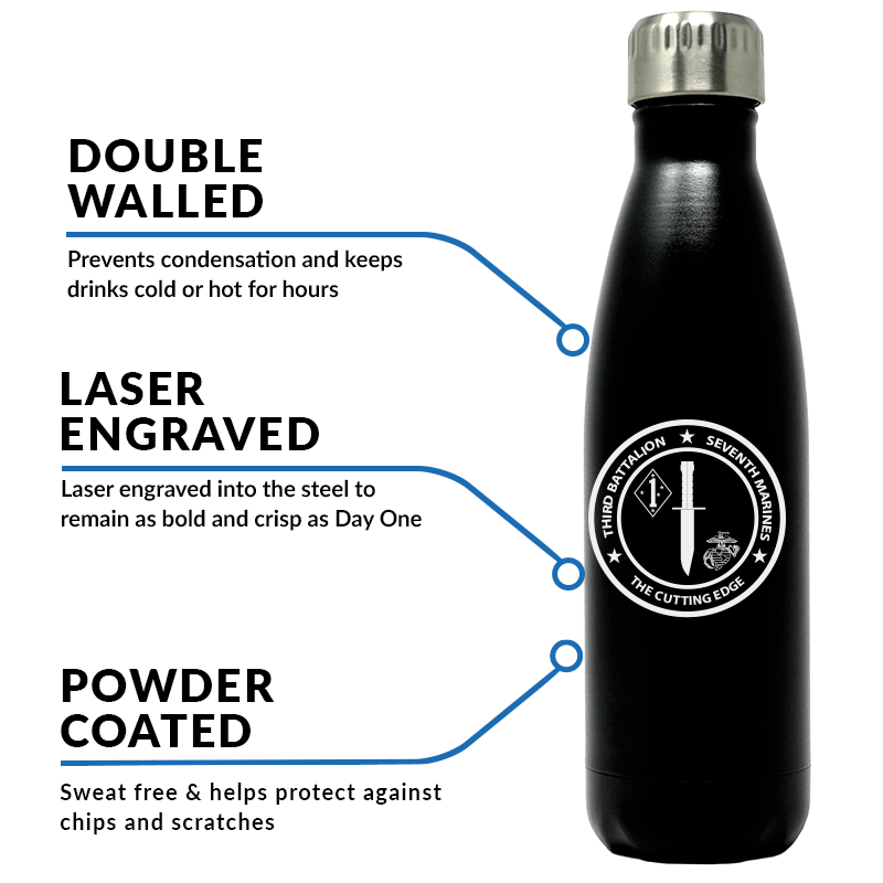Our Marine Corps water bottle features the 3rdBn 7th Marines logo. And you don’t think we’d screen print this artwork, do you? Of course not. The images are laser-etched into the steel to remain forever as bold and crisp as they appeared on Day One.