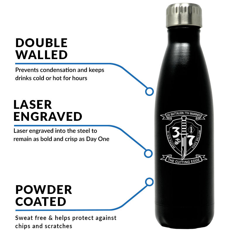 Our 3rdBn 7th Marines USMC water bottles are built from pro-grade stainless steel and finished in durable matte black to survive any terrain – desert, office, or gym. Double-wall vacuum insulation eliminates condensation and keeps your favorite beverages cold for up to 24 hours, or your coffee hot for up to 12.