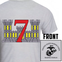 7th Engineer Support Battalion Unit T-Shirt. USMC Unit Apparel Featuring the Unit's Logo on the back and a Small Marine Corps EGA on the chest. Military Veteran Products is Officially Licensed, Owned and Operated by a Marine Corps Veteran. Marines Support your Unit.