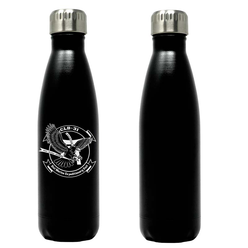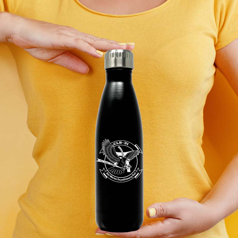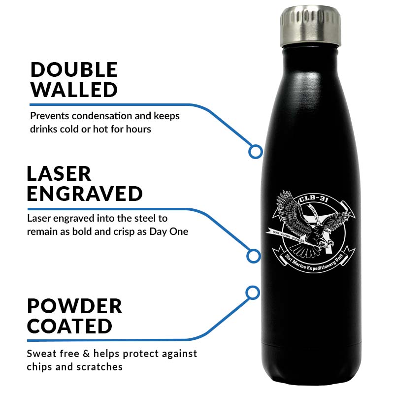 Our Combat Logistics Battalion-31 USMC water bottles are built from pro-grade stainless steel and finished in durable matte black to survive any terrain – desert, office, or gym. Double-wall vacuum insulation eliminates condensation and keeps your favorite beverages cold for up to 24 hours, or your coffee hot for up to 12.