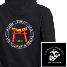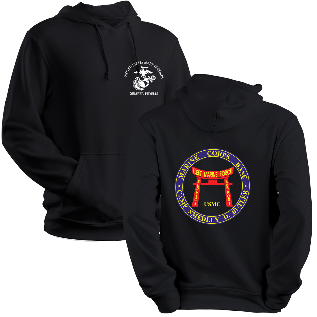 Marine Corps Base Camp Smedley D. Butler USMC Unit hoodie. Celebrate your hard work as a Marine with a Marine Corps Base Camp Smedley D. Butler Marines unit sweatshirt from Military Veteran Products. We have a full line of USMC unit logo gifts and apparel. Great Marine Corps gift idea for men and women. USMC VETERAN OWNED BUSINESS