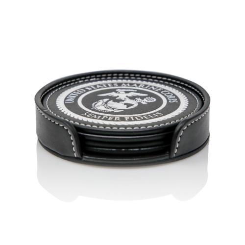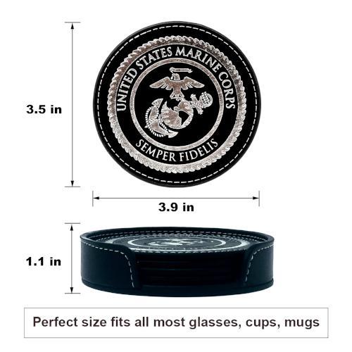- SET OF 4 - This barware beverage coaster set has 4 PU leather military coasters for drinks measuring 3.5 inches with the USMC logo hot stamped and embossed into the coaster to remain sharp and crisp. White stitching around the edge makes a perfect accent.