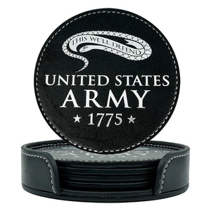 ► US ARMY COASTER - Round shaped US Army Coaster PU leather coaster set. White stitching around the edge makes a perfect accent and the US Army slogan “This We’ll Defend” hot stamped and embossed into the coaster to remain sharp and crisp. Makes a great gift to any military veteran or active duty service member.