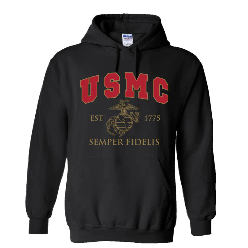 Hot off the press, Marine Corps Gift Shop's 'USMC hoodie depicts USMC over the Eagle, Globe and Anchor with Semper Fidelis text. EGA is flanked by 17 and 75 depicting the birth of the Corps.
