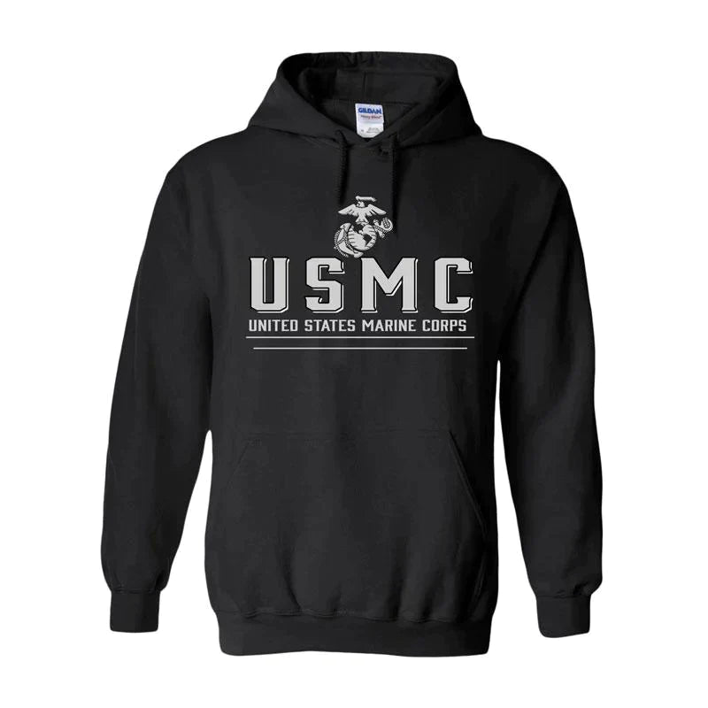 Hot off the press, Marine Corps Gift Shop's 'USMC hoodie depicts USMC text over United States Marine Corps with an EGA on top.